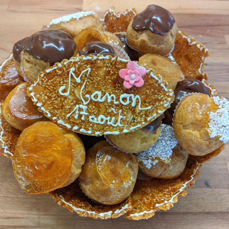Je me déplace avec tout le matériel nécessaire et je vous guide pas à pas. Vous apprendrez à faire des petits choux à la crème de A à Z en suivant la recette traditionnelle. Pour finir en beauté, vous découvrirez comment faire une corbeille en nougatine.